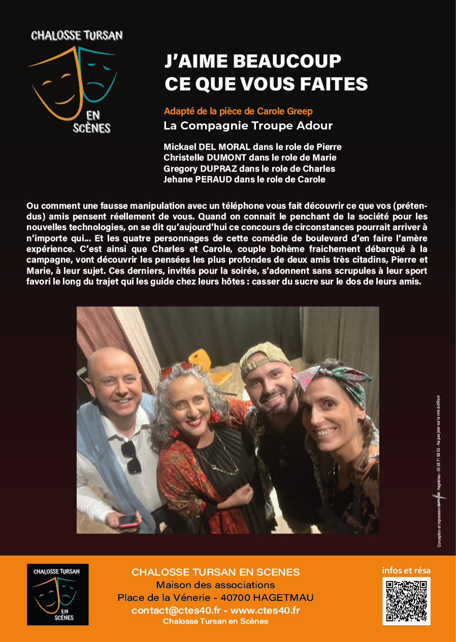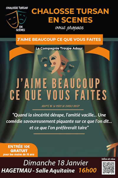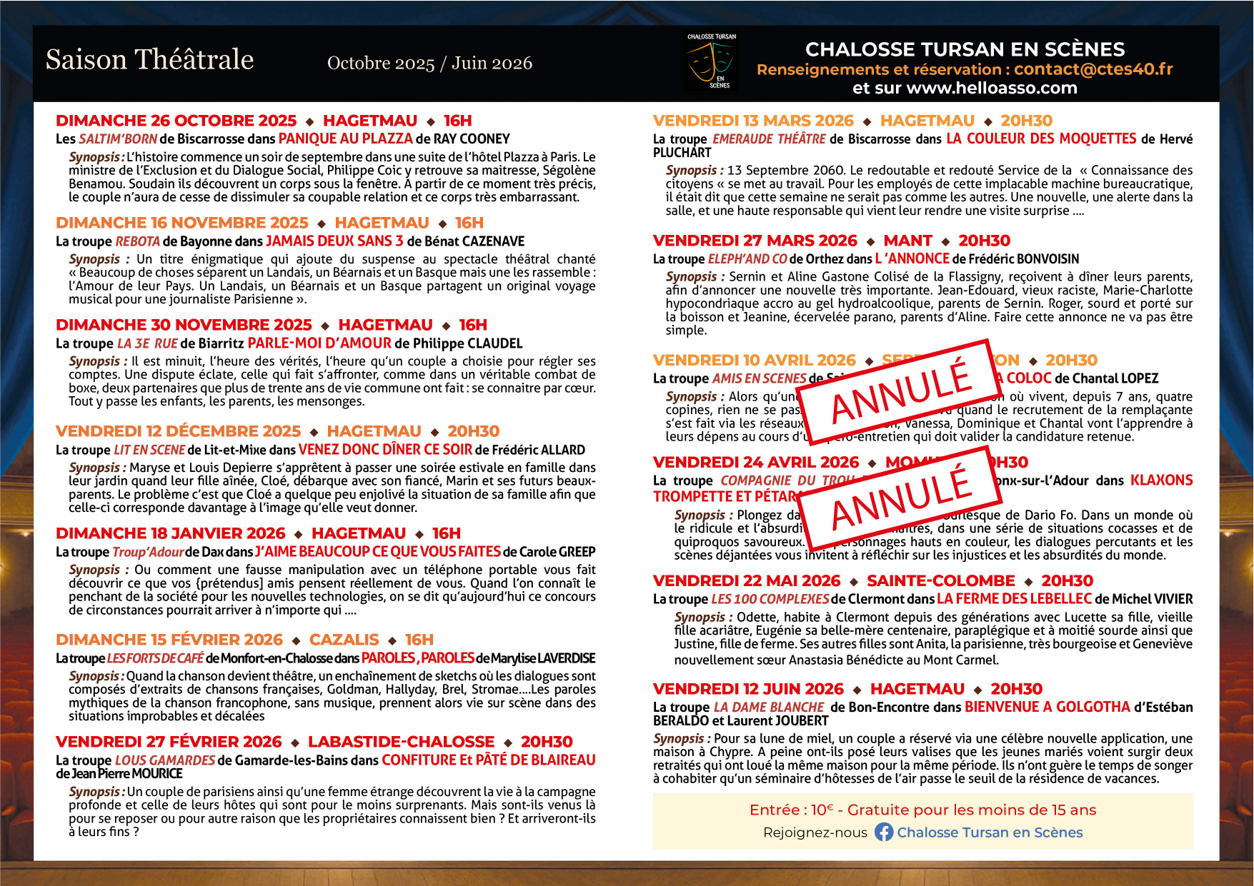 Chalosse Tursan En Scènes est une association basée à Hagetmau qui a pour but d’étudier et de réaliser les actions tendant à développer et à organiser l’animation artistique et culturelle du territoire en vous proposant diverses scènes de Théâtre…